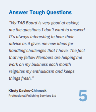Most people join TAB because they know that it will increase the profits of their company and the value of their business. But they don’t realise that they will also receive non-financial values that may be every bit as important — or, in some cases, more important. Business owners consistently improve their quality of life, their work-life balance, learn how to fight burnout better and even work on their interpersonal relationships as a result of their TAB Board Membership. That’s real value.